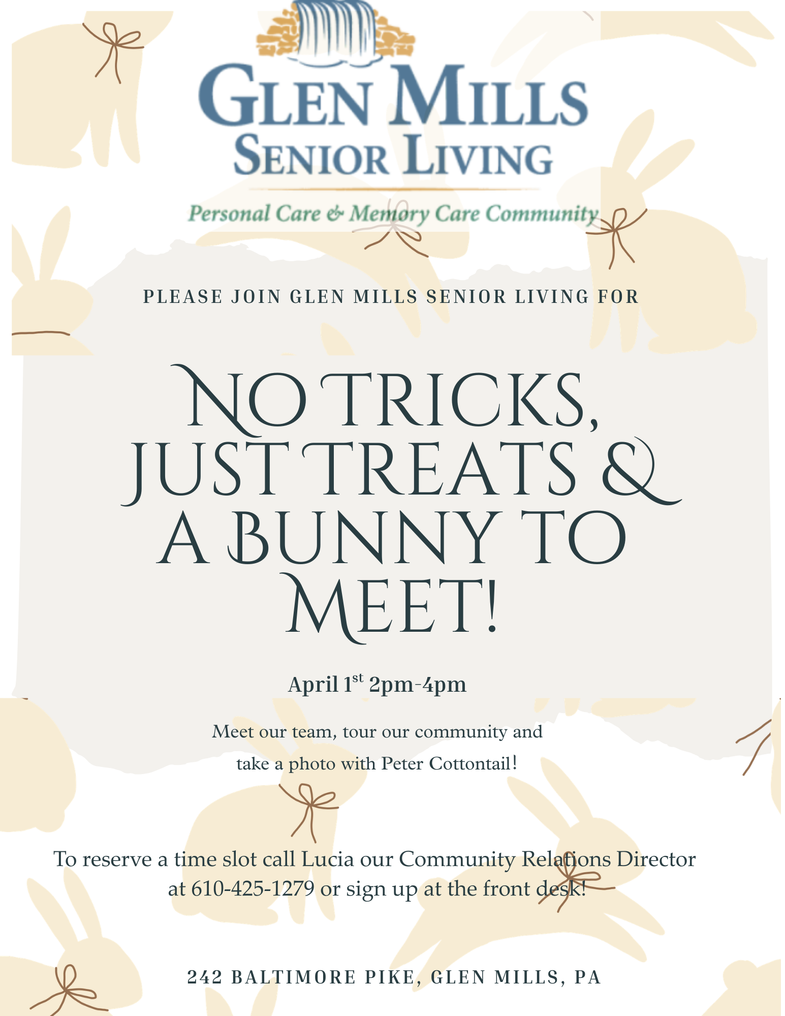 Join us on April 1st from 2–4 PM for a sweet spring afternoon at our community! Meet our residents and staff, tour our community and capture a special photo with the Easter Bunny.