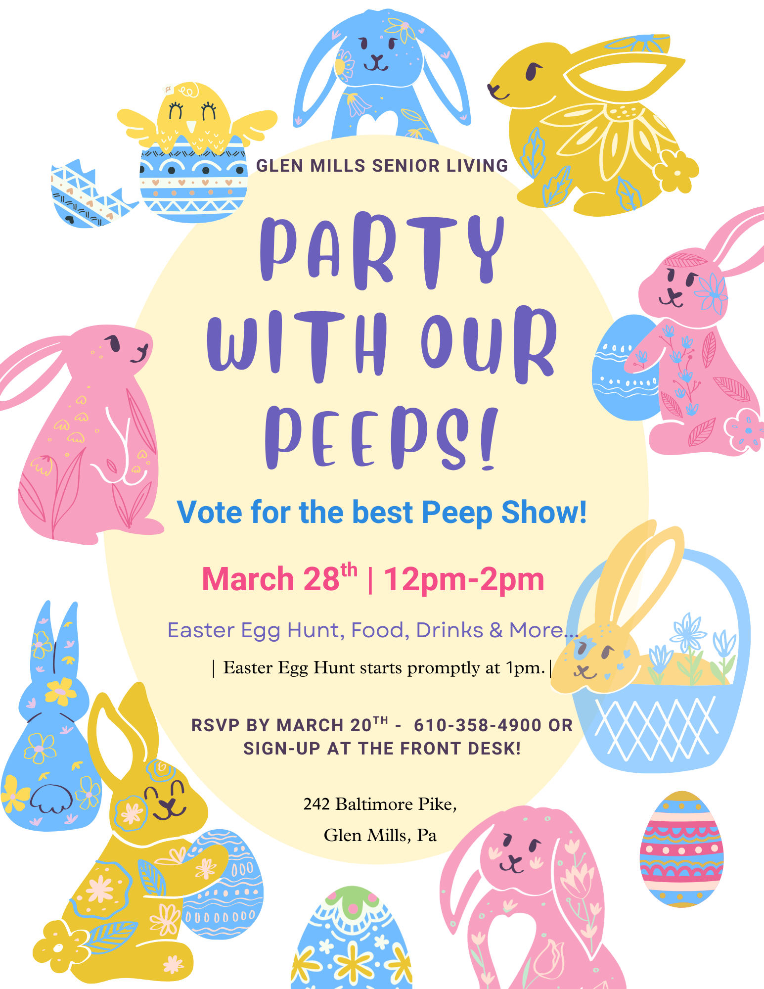 Join us on March 28th from 12–2 PM for an afternoon of fun, food, drinks, and community spirit! Enjoy an Easter Egg Hunt at 1 PM and vote for your favorite “Peep Show” creation before the winner is announced at 2 PM. We can’t wait to celebrate with you! All Peep Show creations are due by March 22nd and will be on display the week leading up to our event! RSVP by calling 610-358-4900 or sign up at the front desk!