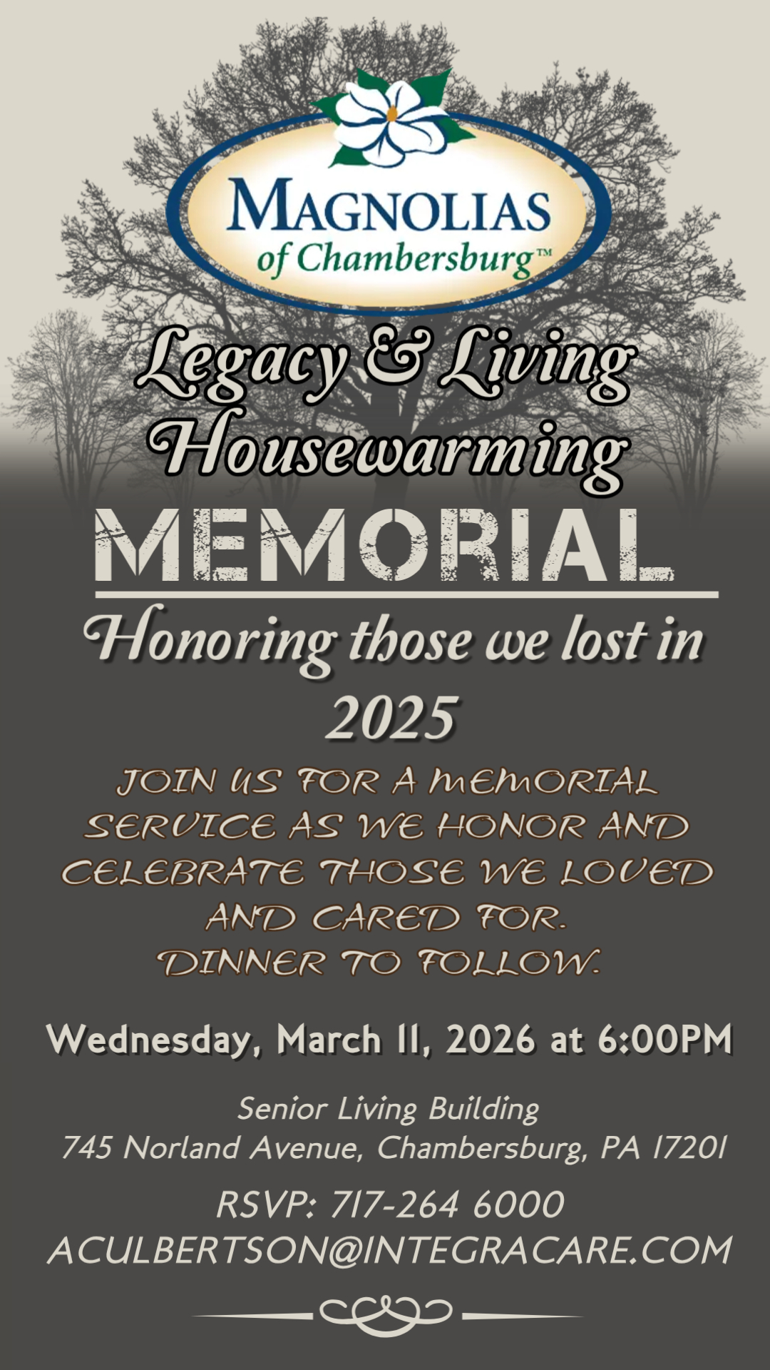 An evening of remembrance and celebration. Memorial service with dinner to follow. RSVP Alyssa Culbertson [email protected], 717-264-6000.