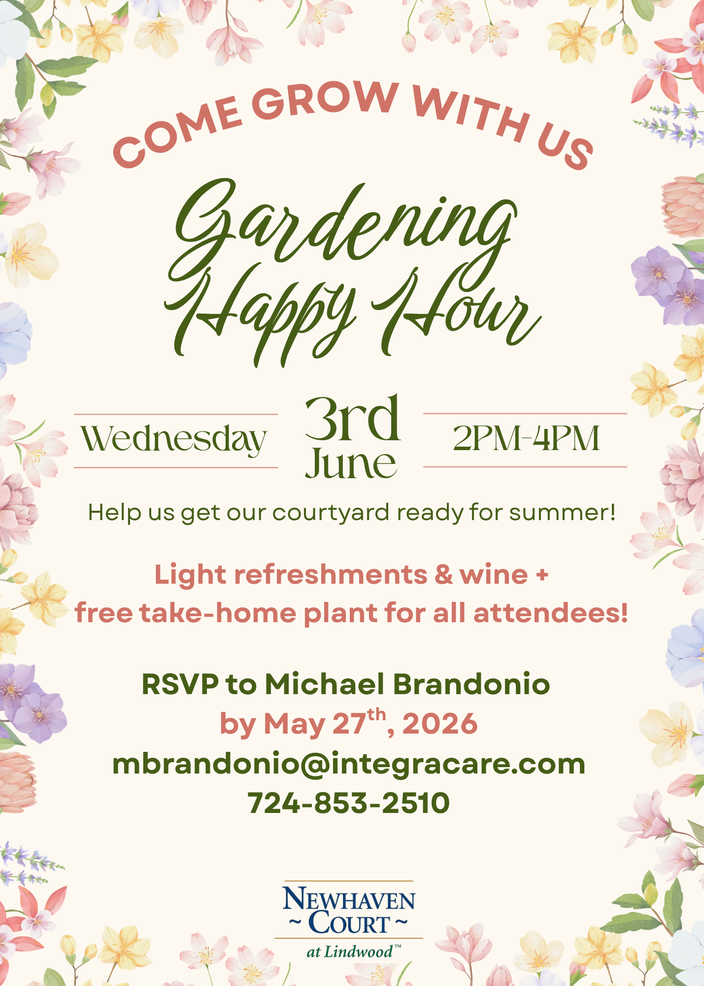 Help us get our courtyard ready for summer by planting fruit and vegetable plants and flowers with residents and team members! All are welcome to attend. To RSVP or if you have any questions, contact Michael Brandonio at 724-853-2510.