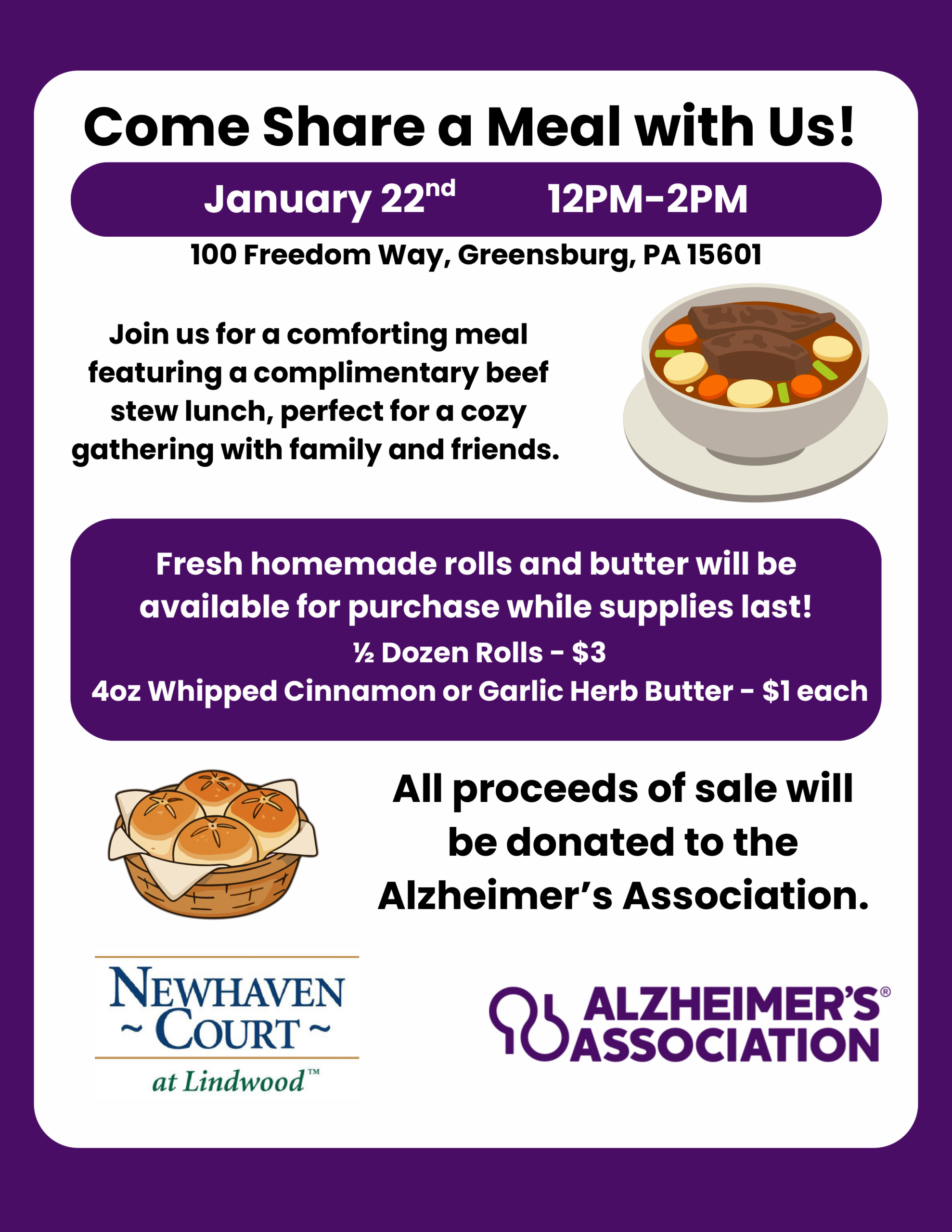 We invite you to Share a Meal With Us and enjoy a complimentary beef stew lunch! Homemade rolls and specialty butters will be available for purchase, with all proceeds benefiting the Alzheimers Association.