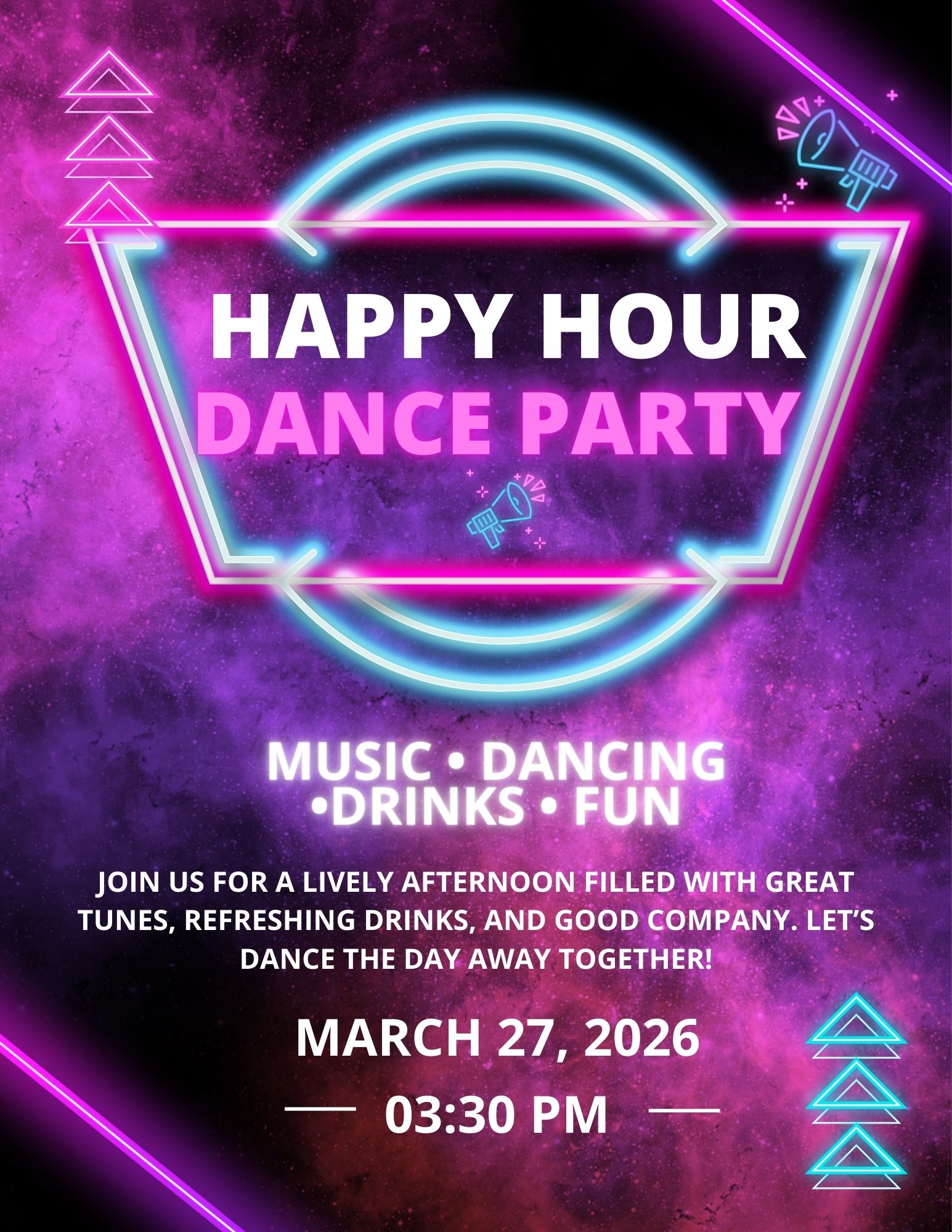 Get ready to dance, laugh, and enjoy a lively happy hour with friends! Join us for music, refreshments, and plenty of fun on the dance floor. Whether you want to dance or just enjoy the atmosphere, everyone is welcome! Come celebrate, socialize, and make it a happy hour to remember!