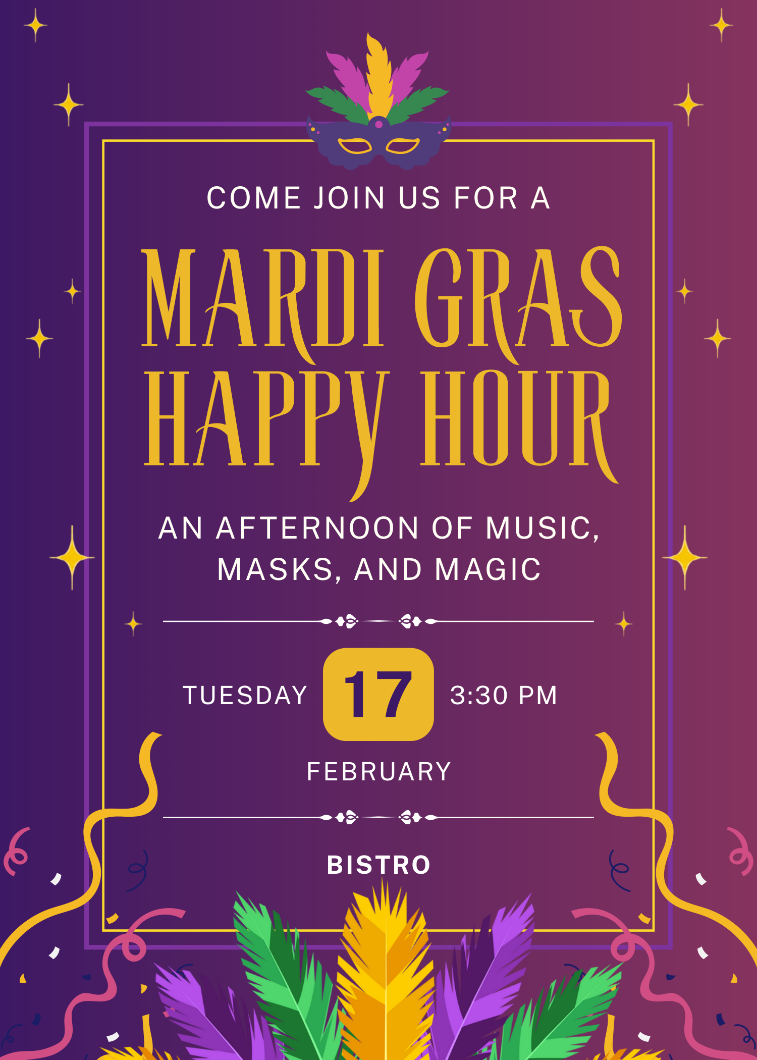 Fill out the form and reserve your spot for Mardi Gras Happy Hour